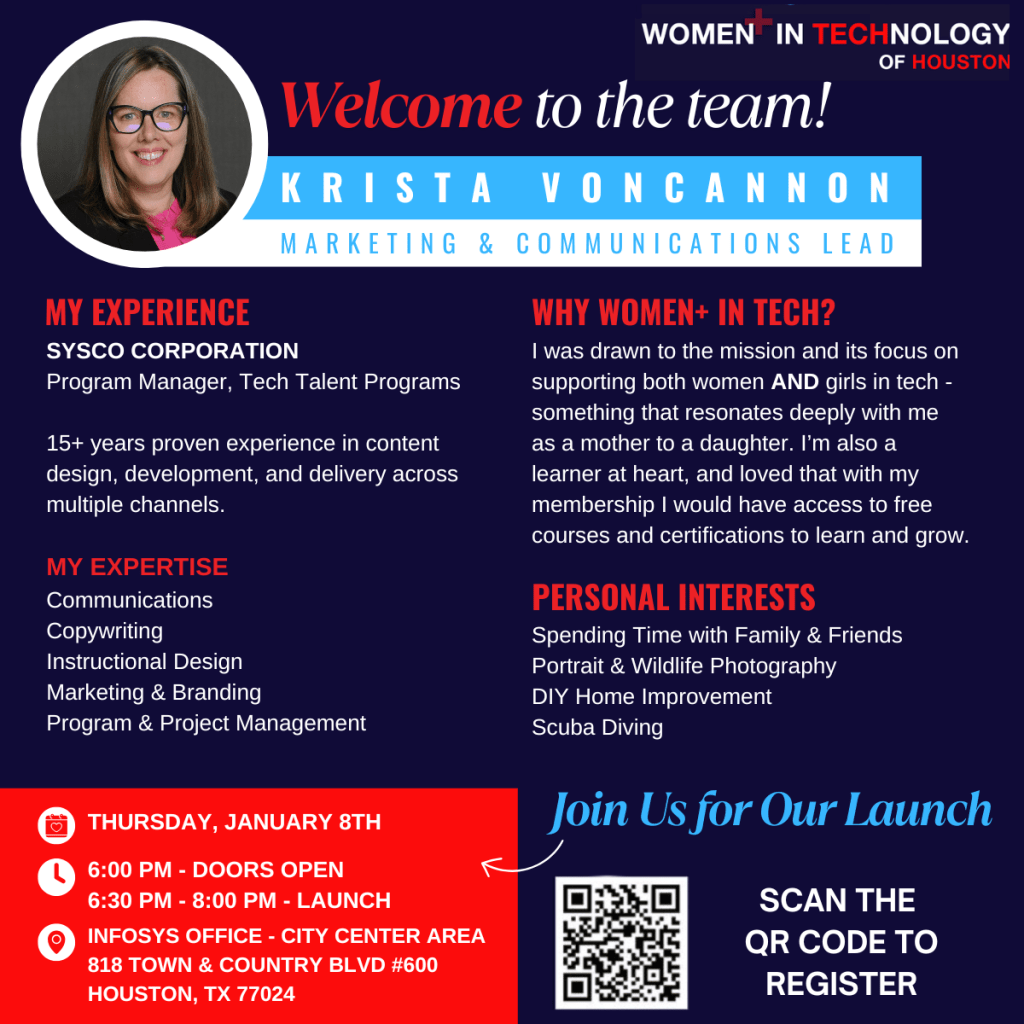 I’m responsible for managing the Women+ in Tech – Houston Chapter’s social media platforms. Check out some samples of my work below!